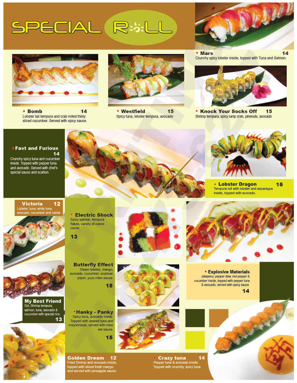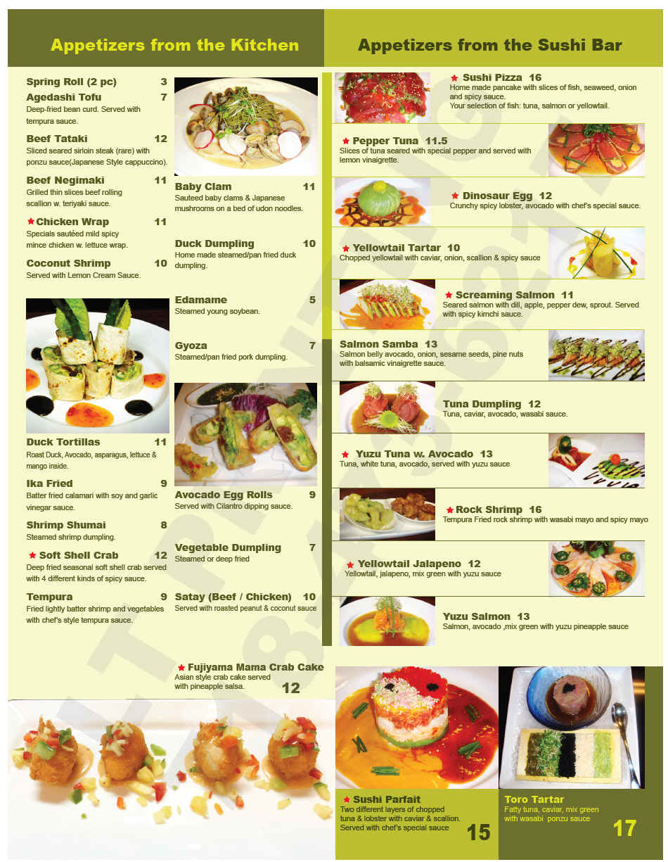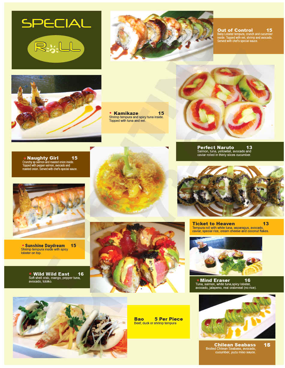 Home | Kitchen Menu | Hibachi Menu | Sushi/Rolls | Drinks/Sake | Lunch Menu | Happy Hour | Contact Us |