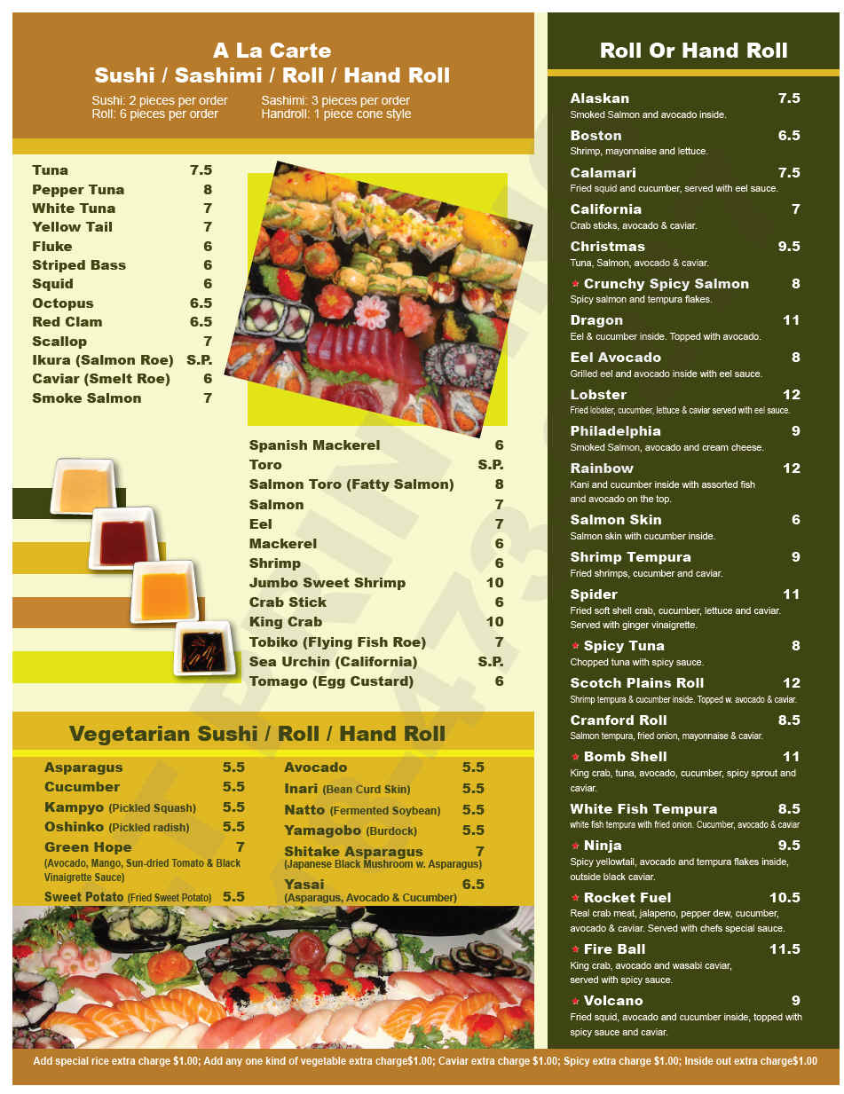 Home | Kitchen Menu | Hibachi Menu | Sushi/Rolls | Drinks/Sake | Lunch Menu | Happy Hour | Contact Us |
